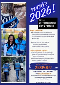- Dobór do Zespołu Antykonfliktowego Policji Sztab Policji w Komendzie Wojewódzkiej Policji w Poznaniu organizuje dobór do Nieetatowego Zespołu Antykonfliktowego. Wszyscy chętni policjanci mogą zgłaszać swoje kandydatury do dnia 20 lutego br. W skład Zespołu Antykonfliktowego (ZAK) wchodzą policjanci wszystkich służb z minimum 2-letnim stażem służby, którzy deklarują dobrowolność pracy w „ZAK”. Chętne osoby wezmą udział w kwalifikacji, polegającej na rozmowie wstępnej z zespołem kwalifikacyjnym. Zgłoszenia można wysyłać na maila: mariusz.lembicz@po.policja.gov.pl